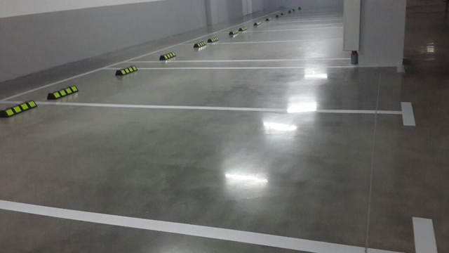 4、車庫環(huán)氧地坪:車庫環(huán)氧地坪能有效地防止停駛車輛帶來的灰塵,尤其是陰雨天的泥濘和水漬。易于清潔,衛(wèi)生環(huán)保,多層涂覆對混凝土、水泥地表有良好附著力。處理后地坪耐磨、抗壓、抗彎強度高于一般水泥沙漿。無毒無味,助燃,多層涂。色彩多樣化,顏色較為鮮艷,并通過現(xiàn)代化調(diào)色技術(shù),使停車場能的色條和諧統(tǒng)一,美觀大方。但是由于是有機材料、易老化。而且環(huán)氧底涂是堿性的,混凝土是酸性的,當(dāng)遇有下面潮濕時堿性更強,容易造成粘接力失效而造成脫殼。而且維護較頻繁,一般3-5年進行一次維護翻新。